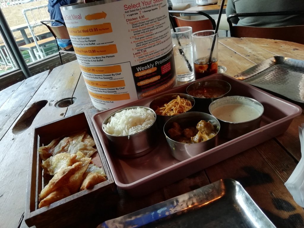 There was also a side tray of delicious flat and sweet breads, one resembled a type of samosa. All very tasty and they were a great help to mop up the remnants of curry sauce from the bowls, which would have been too good to waste. If I heard correctly, I think one of the curries was a railway lamb curry. I’d definitely recommend it.