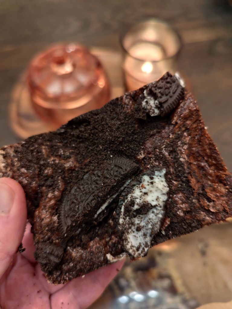 Oreo Brownie, Oreo’s are not everyone’s cup of tea. I personally quite like them. This Brownie looks like a giant Oreo in disguise. It’s got the dark outer edges with a white vanilla cream centre and crushed Oreo biscuits for decoration and crunch. Oreo’s play on that bitter chocolate taste partnered with a sweet milky centre and this brownie does that.