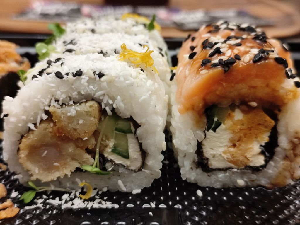 Each set of sushi on the platter was displayed differently, one of the rolls sprinkled with desiccated coconut, which make for a slightly sweet variation. Others rolled in crispy coatings and sprinkles of sesame seeds and even dried orange peel.