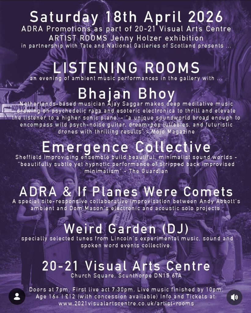 Join us for a truly unique evening of ambient performances set within the ARTIST ROOMS Jenny Holzer exhibition. Curated by Andy Abbott (ADRA), this special programme responds directly to Holzer’s powerful work and immersive environment. Headliner Bhajan Bhoy (AKA musician Ajay Saggar) creates deep meditative soundscapes, drawing on psychedelic raga and esoteric electronica.
